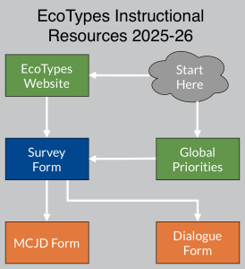 Since 2017, instructors in roughly 100 institutions of higher education in the USA and other countries have used EcoTypes. Many just assign students the EcoTypes survey, but we recommend you prepare your students prior to the survey, and do followup activities after the survey, to derive greater learning value. See the diagram at right for a recommended process.