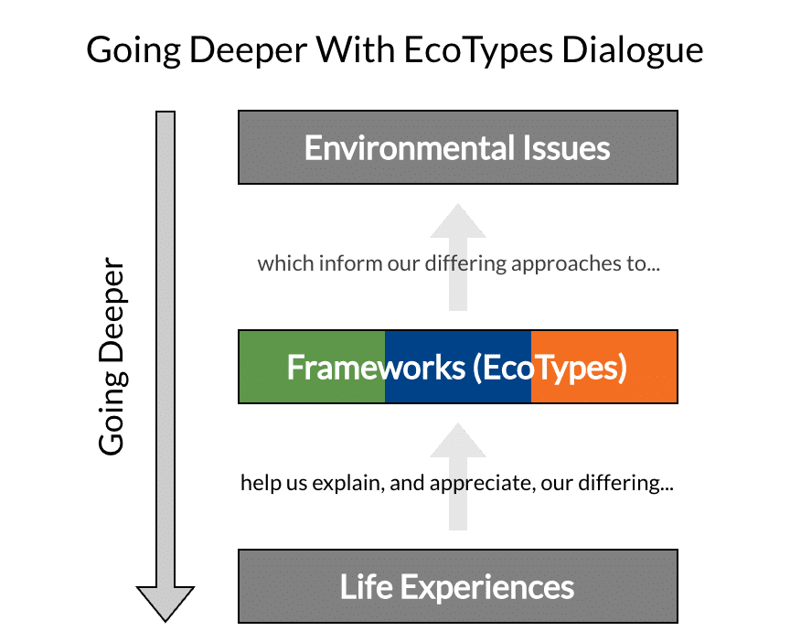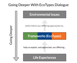 By going deeper, you may experience a more satisfying conversation, even if you ultimately do not agree on a solution to your environmental issue. This role-play dialogue will be less stressful than an actual conversation, but you will experience what it feels like to engage in the back-and-forth of dialogue across difference, so you can gain skills transferable to a real-world opportunity—where going deeper may yield surprisingly satisfying results.